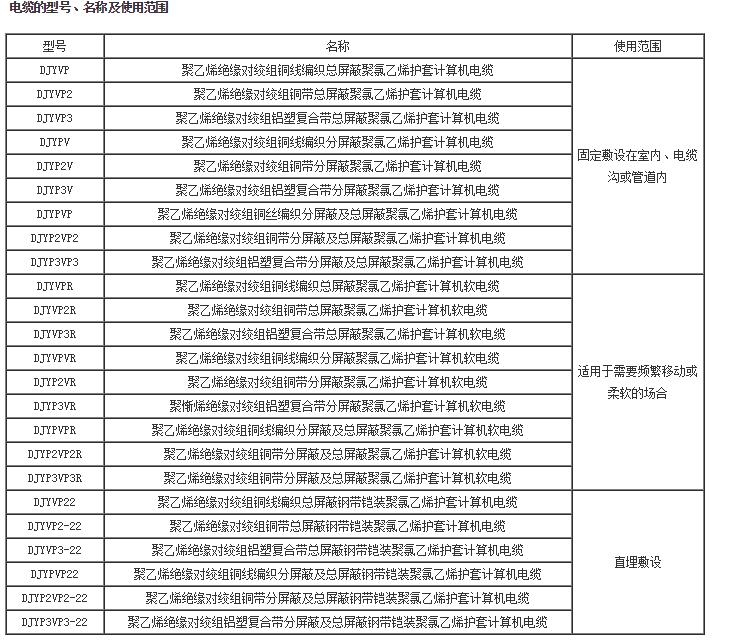 屏蔽材料有圓銅線、銅帶、鋁箔/塑料復(fù)合帶三種。屏蔽對與屏蔽對具有較好的絕緣性能,電纜在使用中若屏蔽對與屏蔽對之間出現(xiàn)電位差時,不會影響信號的傳輸質(zhì)量。 計算機(jī)電纜的型號、名稱及使用范圍見表。